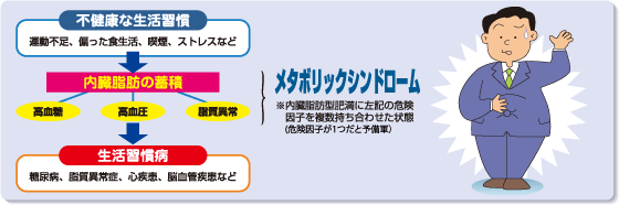 生活習慣病の予防のためには、病気の発症と関わりが深い「メタボリックシンドローム」の該当者・予備軍の生活習慣を改善することが重要です。そこで、特定健康診査・特定保健指導ではメタボリックシンドロームに着目したうえで、