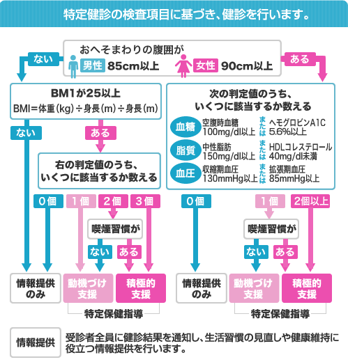内臓脂肪型肥満に着目した、生活習慣病予防のための保健指導を必要とする人を選び出すための健診です。 健診項目には、内臓脂肪の蓄積状態をみるために「腹囲」の計測など特定保健指導の対象者を的確に抽出するための検査項目が含まれており、リスクの高さに応じてレベル別(動機づけ支援・積極的支援)に特定保健指導の対象者の選定を行います(階層化)。