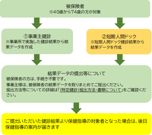 ①労働安全衛生法に基づく事業主健診、または②当組合が補助している短期人間ドック補助金の健診のいずれかの結果データを事業主様から当組合へご提出いただいております。