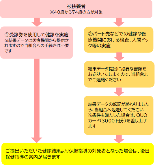 (※1)毎年、年度初め(4月中旬頃)に被扶養者のご自宅へ「特定健康診査受診券」を送付しております。また、年度途中に被扶養者や任意継続被保険者(被扶養者を含む)となった方には、受診券を送付しておりませんので、必要な場合は、当組合までご連絡ください。